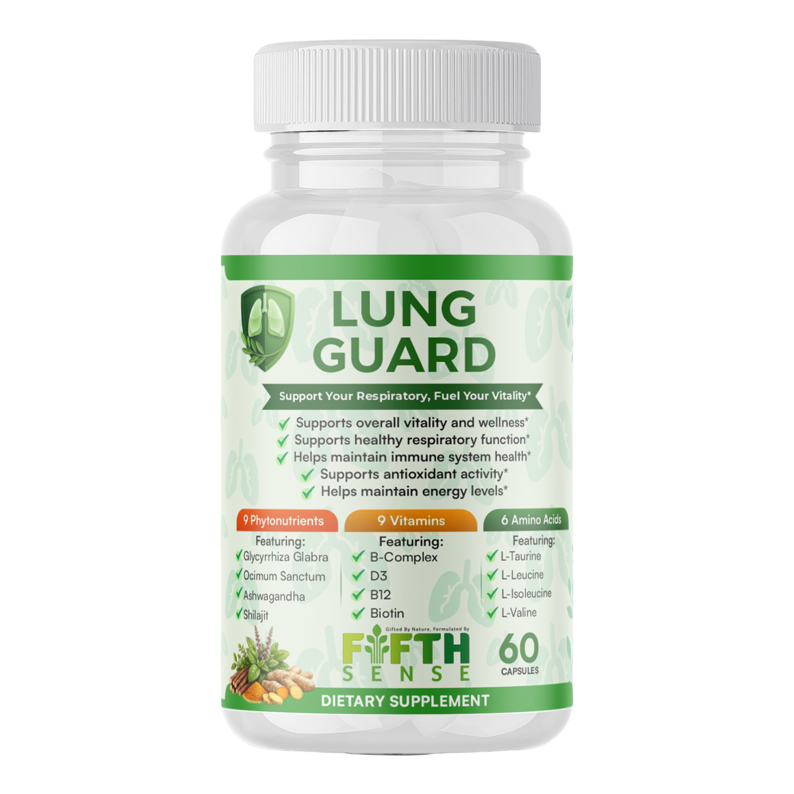 Guard Your Lungs and fuel Your Vitality. Fifth Sense Lung Guard is a scientifically formulated herbal supplement that helps protect your lungs from the harmful effects of smoking, pollution, and oxidative stress. Designed for smokers and urban dwellers alike, Lung Guard combines ancient herbal wisdom with modern science to restore vitality, support respiratory health, and strengthen the body’s natural defenses